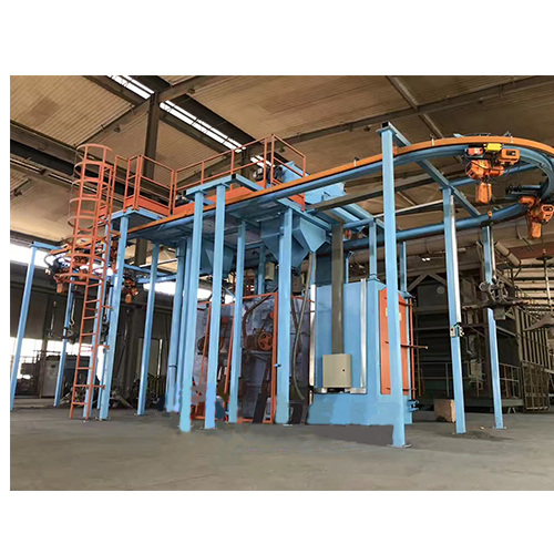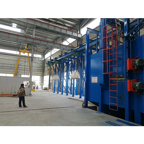 Дробеметная установка с подвесной рельсовой системой может использоваться для очистки и упрочнения поверхности крупных и средних отливок и поковок, а также деталей стальных конструкций в машиностроении, сосудах высокого давления, автомобилестроении, судостроении, производстве электродвигателей и других отраслях промышленности. Используется для улучшения качества внешнего вида и условий обработки поверхности деталей изделия. Для больших заготовок, которые можно подвешивать, можно использовать два электрических подъемника для подъема заготовок в зону дробеструйной обработки, а также для дробеструйной обработки и очистки заготовок. Несколько головок крыльчатки расположены с помощью компьютерного моделирования. Конструкция защиты и уплотнения полости по запатентованной технологии используется для придания оборудованию характеристик усовершенствованной конструкции, высокой эффективности производства, хорошего качества очистки и высокой степени автоматизации.