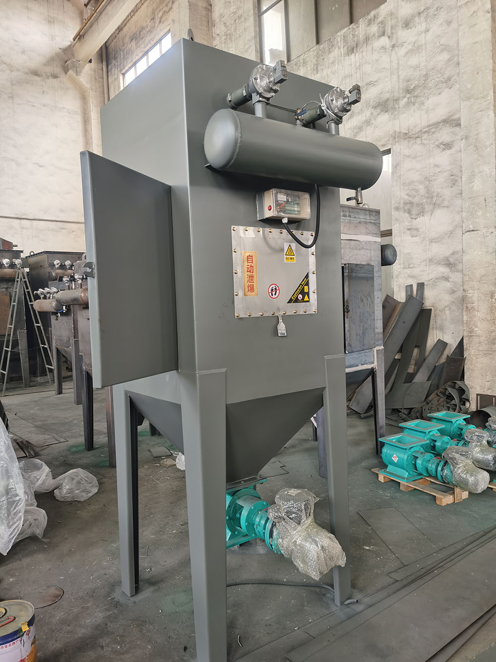 Пылеуловитель картриджного типа с импульсным фильтром снабжен воздухозаборником, фильтрующим картриджем, воздуховыпуском, воздушной подушкой, импульсным контроллером, продувочным клапаном, выдувной трубкой и т.д. Фильтрующий картридж сложен и свернут из полиэфирного волокна. Нижний конец закрыт, а центр фильтрующего картриджа верхний конец расположен в нижнем отверстии выдувной трубы. После того, как пылесодержащий газ поступает в пылесборник из воздухозаборника, скорость воздушного потока замедляется, и крупные частицы покидают воздушный поток и оседают в камере сбора пыли. Когда микропылесос проходит через фильтрующий картридж с потоком воздуха он блокируется на внешней поверхности фильтрующего картриджа, и чистый газ выпускается из воздуховыпускного отверстия; когда пыль на поверхности фильтрующего картриджа становится густой, импульсный контроллер выдает команду на его открытие. С помощью продувочного клапана сжатый воздух в воздушная подушка выбрасывается с высокой скоростью через выдувную трубу и в то же время создает в несколько раз большее количество воздуха, впрыскиваемого в фильтрующий картридж из окружающего воздуха. И быстро выстрелил изнутри наружу. Пыль с внешней поверхности фильтрующего картриджа сдувается в камеру сбора пыли и, наконец, выгружается из ведра для золы. Пылесборник использует метод импульсного распыления для очистки, который не только полностью очищает пыль, но и не наносит вреда фильтрующему картриджу, и срок службы фильтрующего картриджа может быть гарантирован. Процесс очистки автоматически контролируется импульсным контроллером. Можно использовать контроль перепада давления или контроль времени.